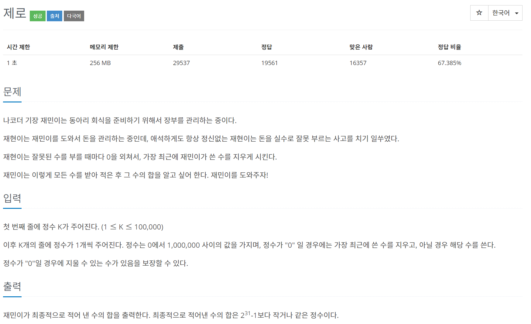 #10773번 제로 코드 설명 가장 마지막에 들어온 수를 지워야하기 때문에 '스택'으로 코드를 작성함. STL을 사용하지 않고 stack배열을 선언한 후 push(), pop()을 만들어 풀어봄. - push() void push(int n) { stack[E] = n; E++; return; } E는 요소가 들어가야할 곳을 뜻하고 초기값은 0임. n을 입력받으면 stack의 E번째 자리에 넣어주고 E를 1 증가시킴. - pop() void pop(int n) { E--; return; } E를 1 감소시켜주어 push()했을 때 새로운 숫자가 들어오게 함. 코드 #include using namespace std; int k,n; int stack[100001] = { 0, }; int E= 0; vo..